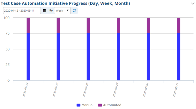 A stacked bar graph that shows the amount of Test Cases that are either manual, automated, or both. This data is tracked by day, week, or month. |