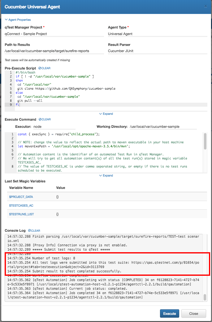 Select the Execute button to kick off the agent execution and you will see the logs shown in the Console Log section. If the execution is successful, you'll see the test run logs being submitted to qTest Manager.