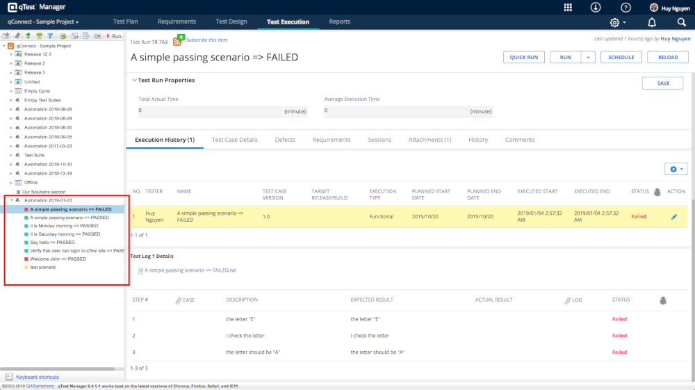 From qTest Manager, select the project qConnect Sample Project, and then click the Test Execution tab. Do the following: