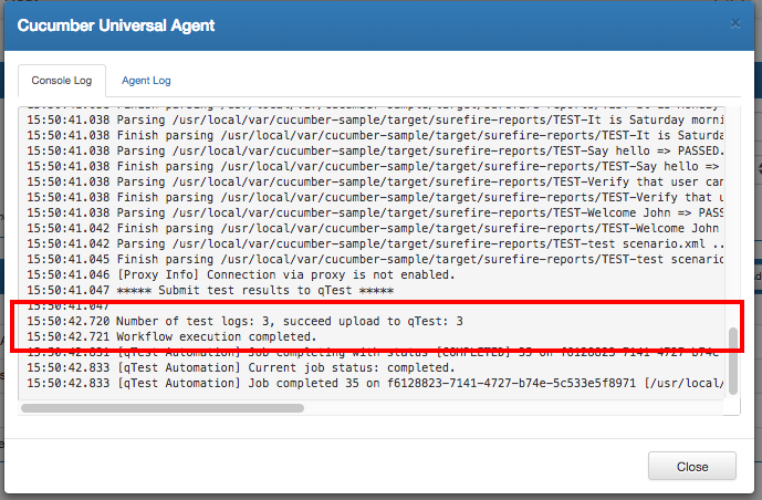 If the value of TESTCASES_AC variable is empty, which means there is no test runs being scheduled to be executed (such as when this Universal Agent is executed in the first time), we will let the agent execute the all scenarios in our Cucumber project then create test run logs to qTest Manager as the execution result.