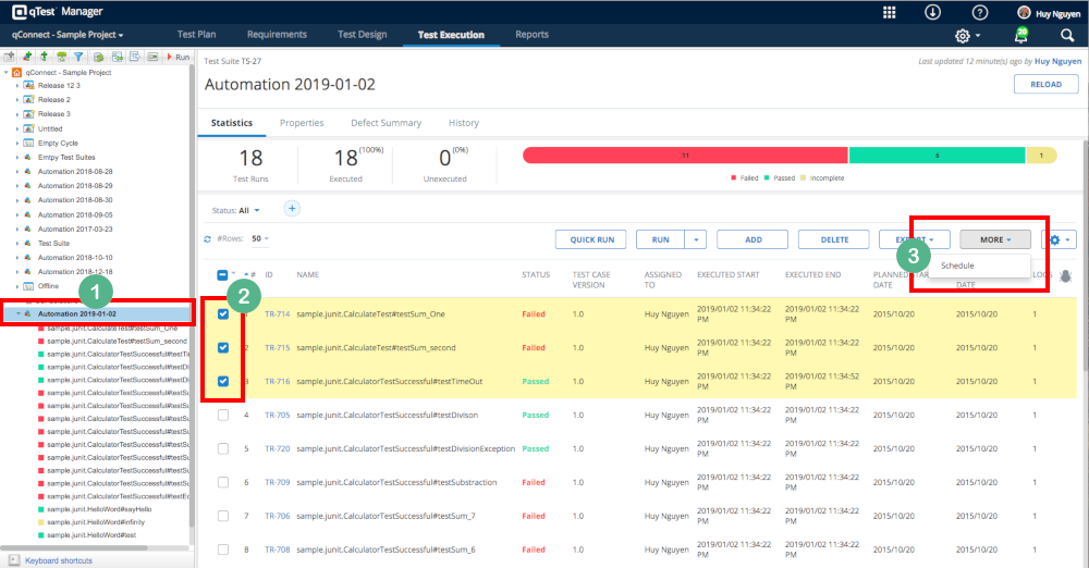 From the Test Run list in the right, select the first three test runs. Click the More button and select Schedule.