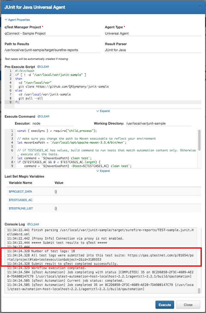 You will configure the Execute Command to execute our JUnit project with maven with the following Node.js script. What it does is to resolve the value of magic variable TESTCASES_AC then performs the following: