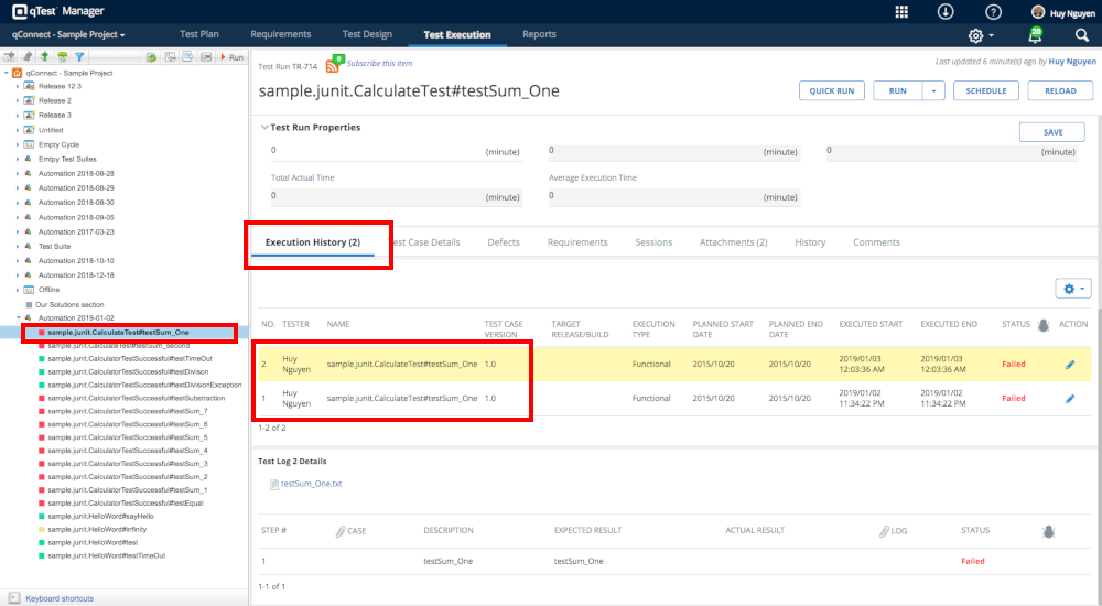 Now get back to Test Execution of qConnect Sample Project in qTest Manager. Click on each test run that was scheduled to be executed, you'll see the Execution History of each test run was updated with two test run logs: one test log created when the agent was executed in the first time, and one test log for the scheduled job execution.