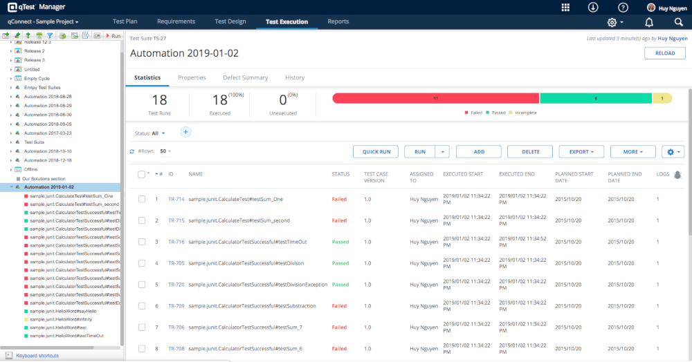 Now, access qTest Manager. Navigate to the qConnect Sample project and select the Test Execution module. You'll find the execution results has been submitted as test run logs under a Test Suites namws Automation YYYY-MM-DD, as shown below.