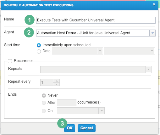 The Schedule Automation Test Executions dialog will display. Enter the following: