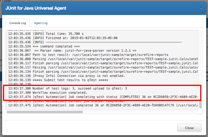 Select the Execute button to kick off the agent execution and you will see the logs shown in the Console Log section. If the execution is successful, you'll see the test run logs being submitted to qTest Manager, as highlighted in below screenshot.
