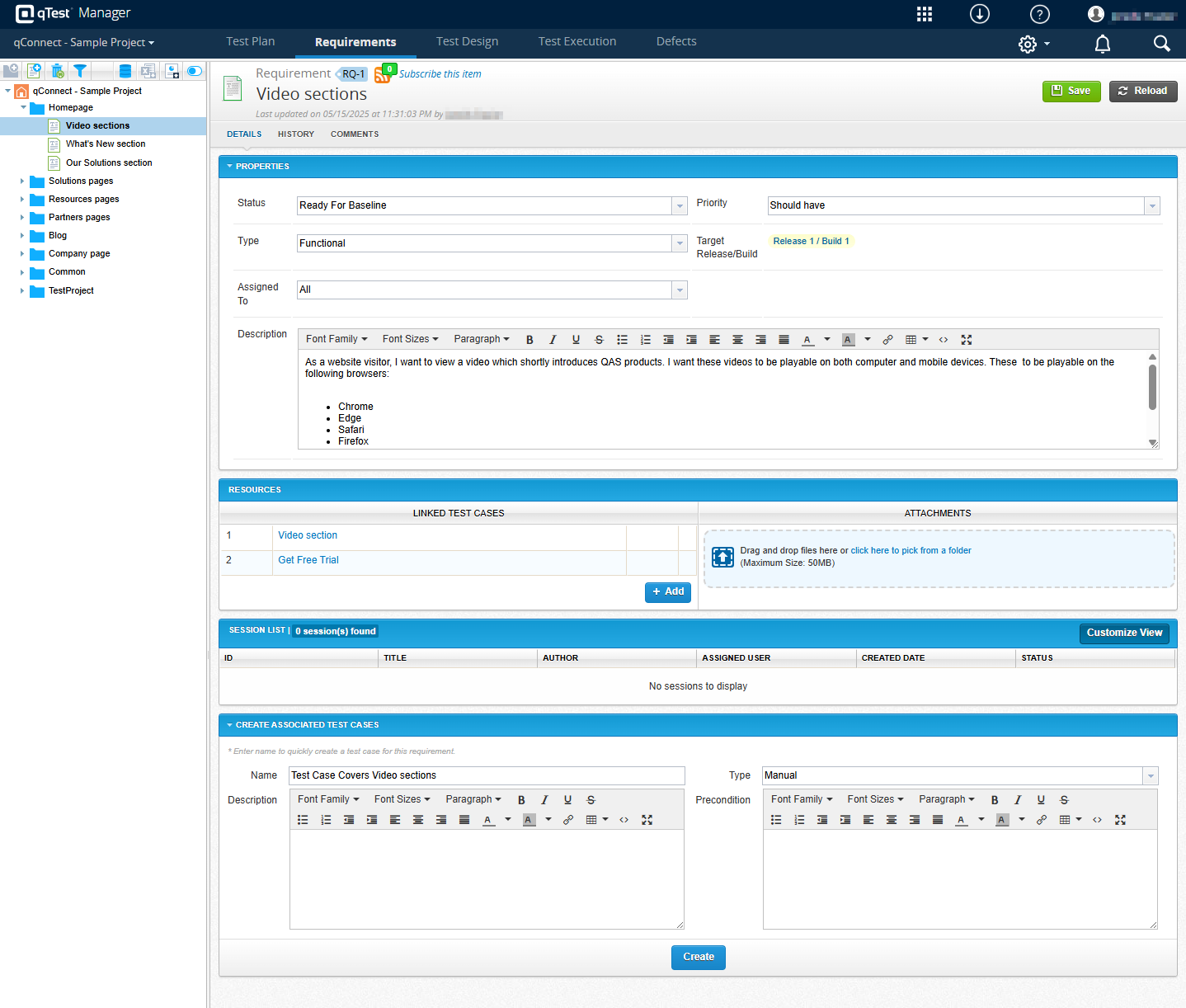 Requirements describe in detail what development goals you want to achieve in order for your application under test to meet its objectives. Once you have requirements, you can attach them to releases, builds, and test cases. This helps you always keep an eye on the final goal, throughout your testing process.