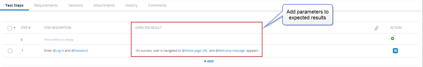 To add a parameter to the expected results text, access the test case that you want to call a parameter in. On the test step row, click the Expected Result field to display the field as a text edit box. In the text edit box, type an @ (at sign). Then type and select the identifier of the parameter that you want to call.