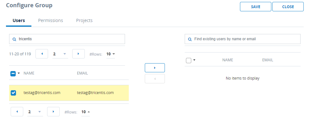 Select the check box next to the Project name, and then click the right arrow to move the Project to the list of existing Projects for the user group.