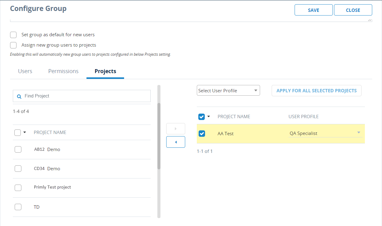 To assign the same User Profile to multiple Projects, select a User Profile in the Select User Profile field, and then click Apply for All Selected Projects.