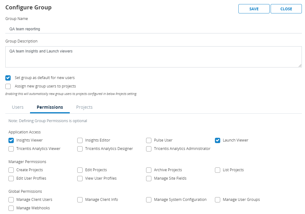 You can assign Projects to a user group, which grants users in the user group access to the selected Projects. In addition, you can select a User Profile for each Project, which indicates the permissions that the users will have in the Project. For example, you can create an Admin user group for administrators, and then assign all Projects to the user group with the Admin User Profile. This will grant all users in the Admin user group access to all Projects with Admin permissions.