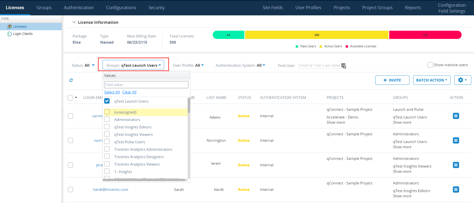 The License Information screen refreshes to display only users that are assigned to the selected user groups.