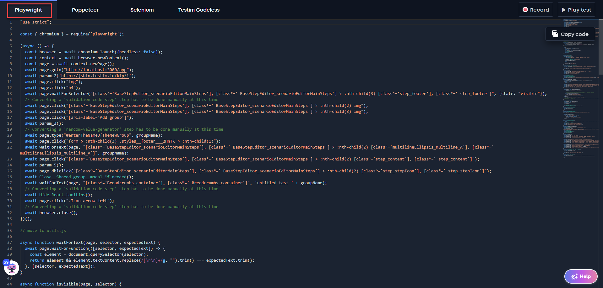 You can export a Testim test as code that is adapted for Playwright. The export process involves adding a suffix to the URL of the test when it is open on the Editor.