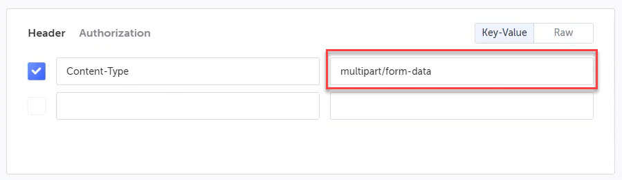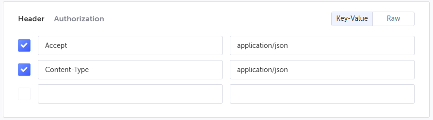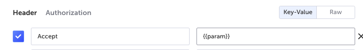 In the Header section, enter the header Key-Value pairs that need to be sent with your API. Select the Key-Value (default) option to enter the header in separate key and value fields. Select the Raw option to enter the values in their raw format (e.g. when copying from the browser's devtools network panel).