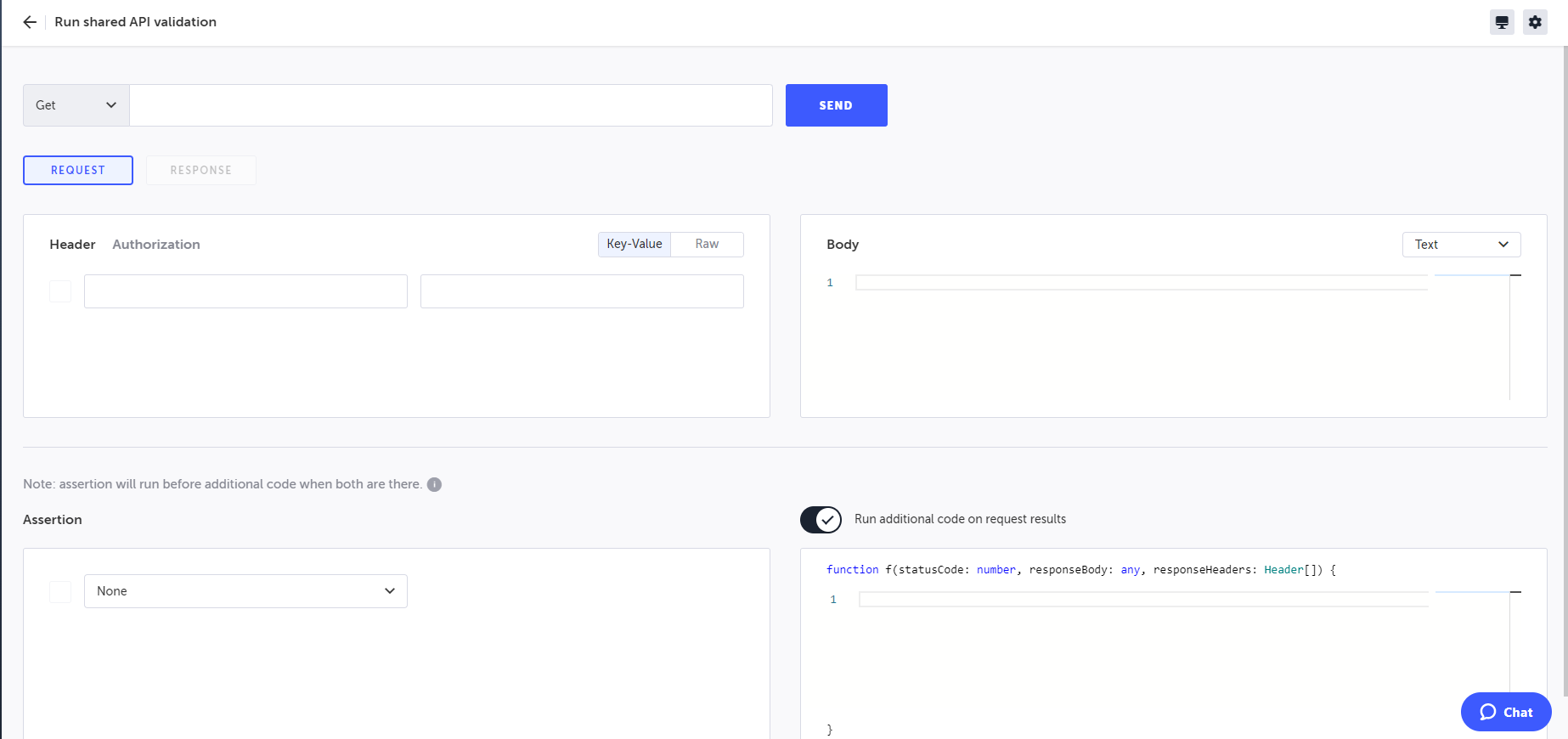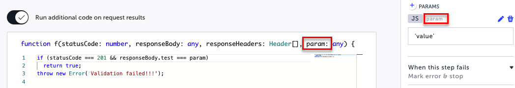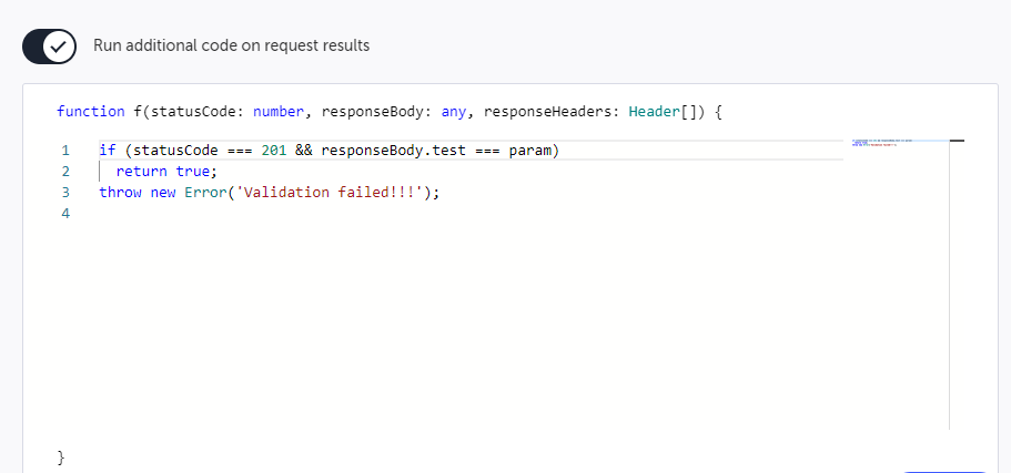 Select the Run additional code on request results switch if you want to run code that will perform additional validations that are not possible through the assertion or add additional functionality to the validation. For example, throwing an error message following a failed validation. You can add parameters to the code. For more information, see Using Parameters section below.