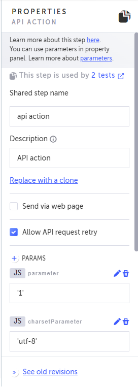 You can use parameters in the API step as you would in any other step that uses code. You can use parameters in the sent HTTP request, in the HTTP response, and/or as part of the Assertion. Parameter can be either in-param, as dependency injection, or out-param via the exports/exportsGlobal. You can also access any other variables in the test's scope.