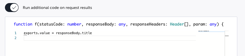 Select the Run additional code on request results switch if you want to run code that will use the returned data from the API call for cases other than validation (e.g. to extract parameters, close DB connections, etc.). You can run any JavaScript code, and use the data returned from the API call, including the status code, response headers, and response body. If the response body content type is XML/JSON, the parameter type will be an Object, otherwise the parameter type is String.