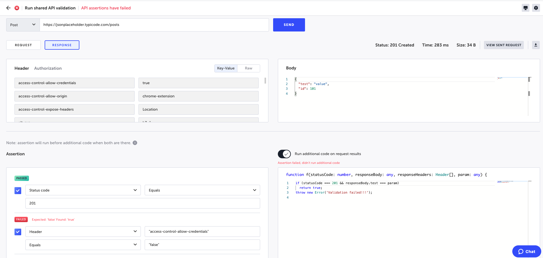In the Assertion section, you can optionally assert on the header, body, or status code response without manually entering code. The Assertion is run before the code in Run additional code on request results (see below). The response for the assertion can be Passed (TRUE) or Failed (FALSE). If the Assertion fails, the step and test will fail and the Run additional code on request results code won’t be executed.