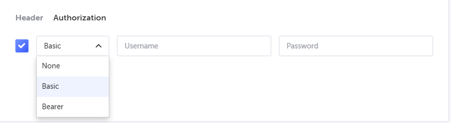 None – select this option if you do not want to send authorization parameters or if you want to use an authorization type other than Basic or Bearer. In this case you will have to manually enter the Authorization parameters under the Header tab.