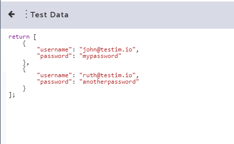 "username": "tomsmith", "password": "SuperSecretPassword!" Running the test from the editor will only run the first data set. When you want to run additional data sets, you will need to use the CLI, which includes the beforeSuite hook that overrides test data provided in the UI, or the Scheduler.
