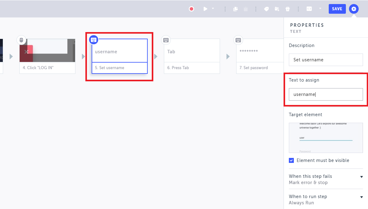 In the Text to assign field, replace the existing text with the name of the parameter. For example, in the Set username step, enter the username parameter.
