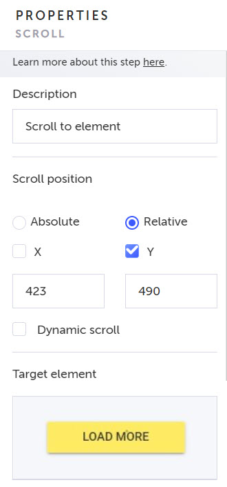Scroll to Element: this scroll step is automatically recorded when you scroll and interact with a specific element on the page.