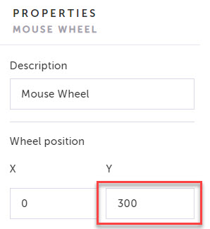 When a Mouse Wheel step is recorded, Testim captures the target element and the wheel position change related to the target element. → To adjust a Mouse Wheel step: