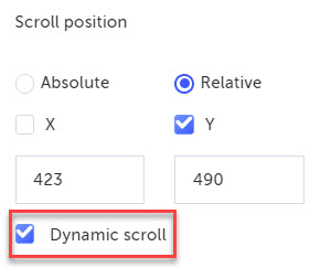 Note: For Scroll to Element steps, Testim automatically set the Scroll Position is automatically to Relative positioning. Testim captures the X and Y axis location of the element, but only the Y axis is checked. This is because Testim only needs to know how far down from the top of the page the element is located.