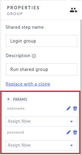 Add the group to another test by following the instructions in the Reusing a Group section. In this group, the parameters are already assigned to the relevant steps, but the values are empty.