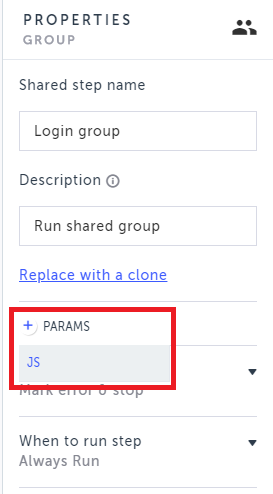 Shared parameters If its a shared group/step, the JS/HTML parameters themselves will be shared across tests, but not their inner values, so the parameters can be reused in other tests with other values. Deleting a parameter from a shared step or group will have a cascading effect on all instances of that step or group, and this action cannot be undone.