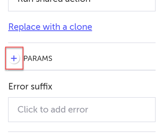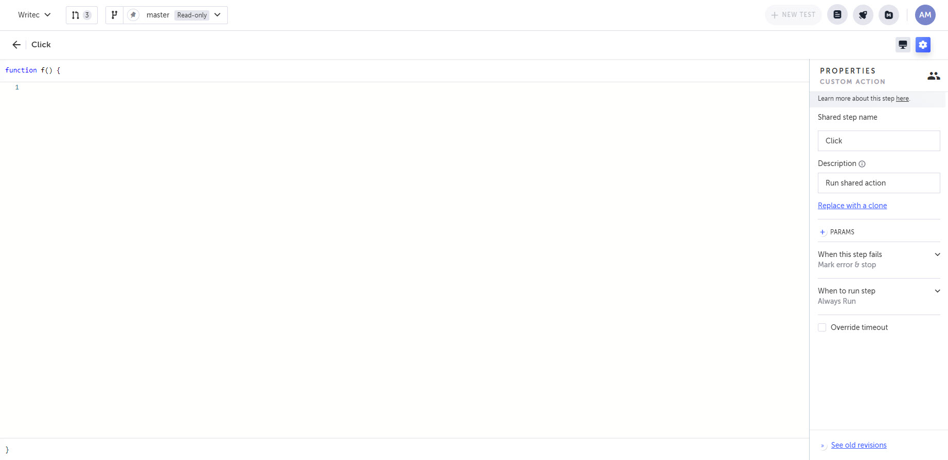 In a new or existing test, add a step for which you want to define the parameter. For example, add an Add Custom Action step ('+' ⇒ Testim predefined steps ⇒ Actions ⇒ Add Custom Action) .
