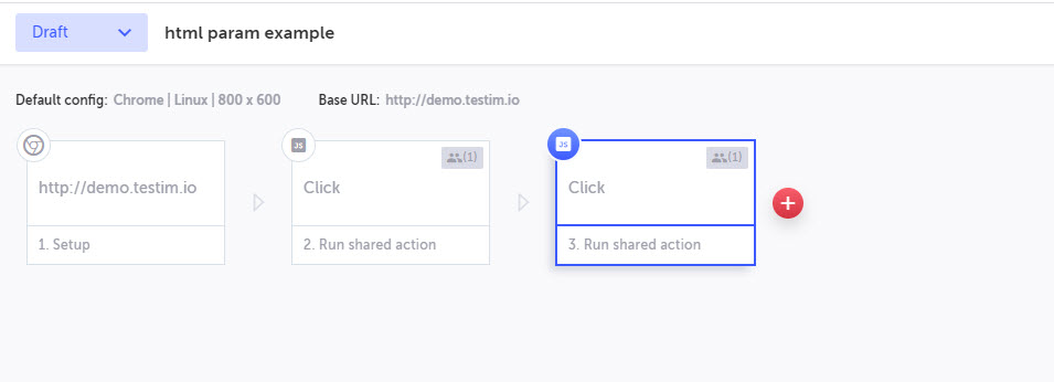 In the same test, add the shared step that we have previously created from the Shared Steps menu. For example, '+' ⇒ Shared steps ⇒ Click