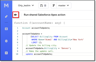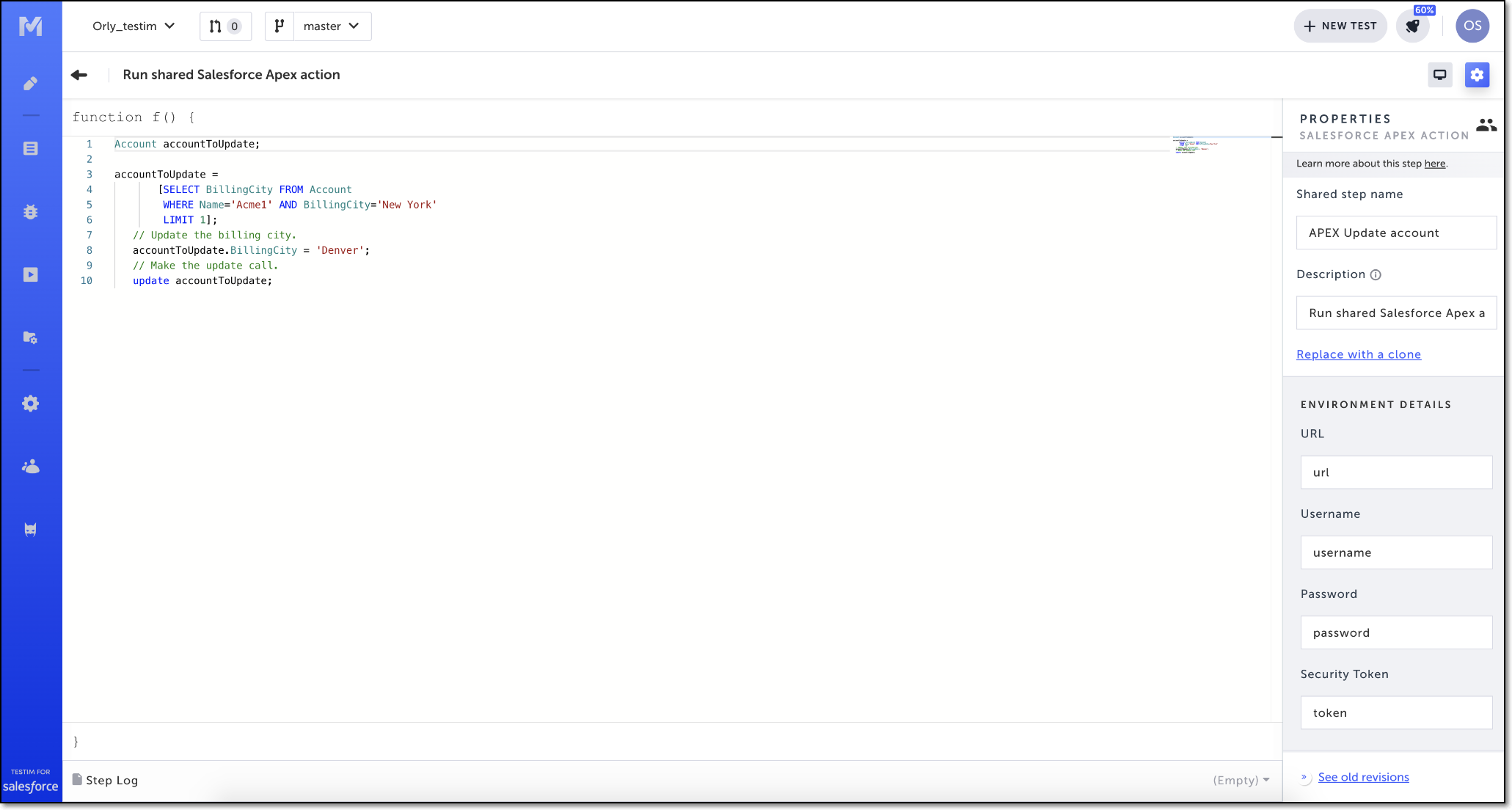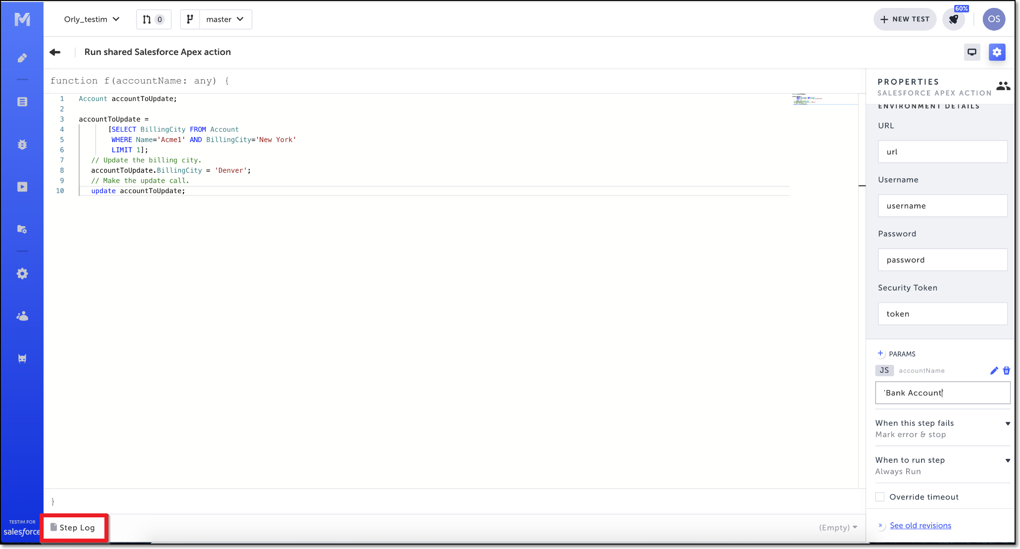 After a test containing a Salesforce APEX action step is run, a step log is available in the code editor with your test results from Salesforce. → To view the APEX action result log: