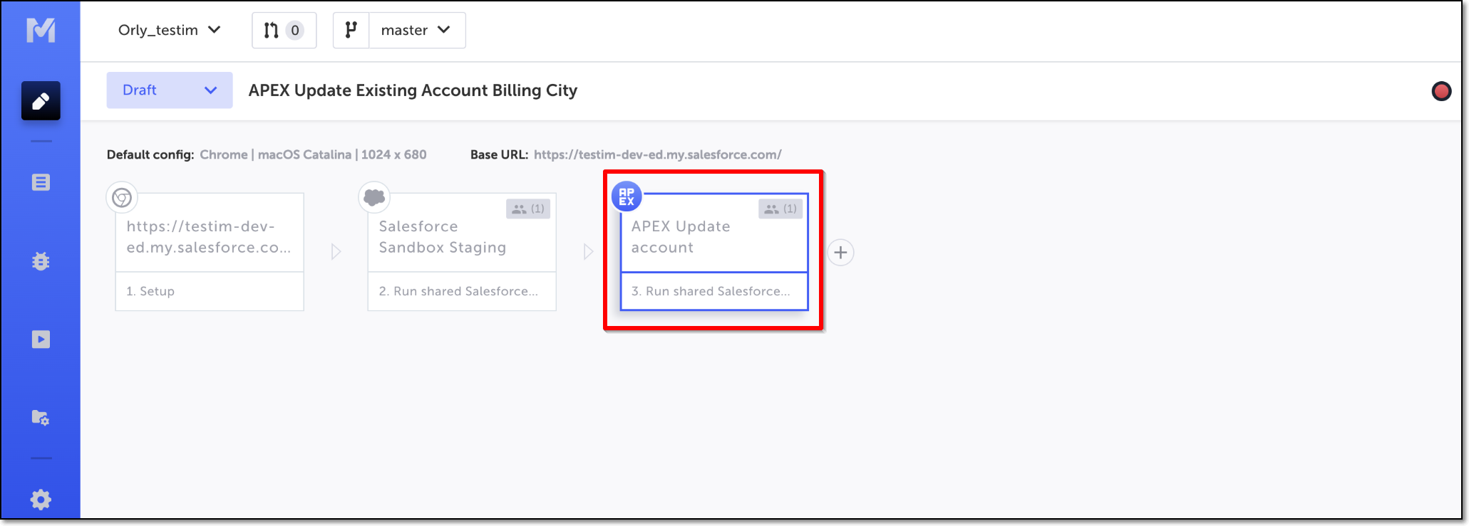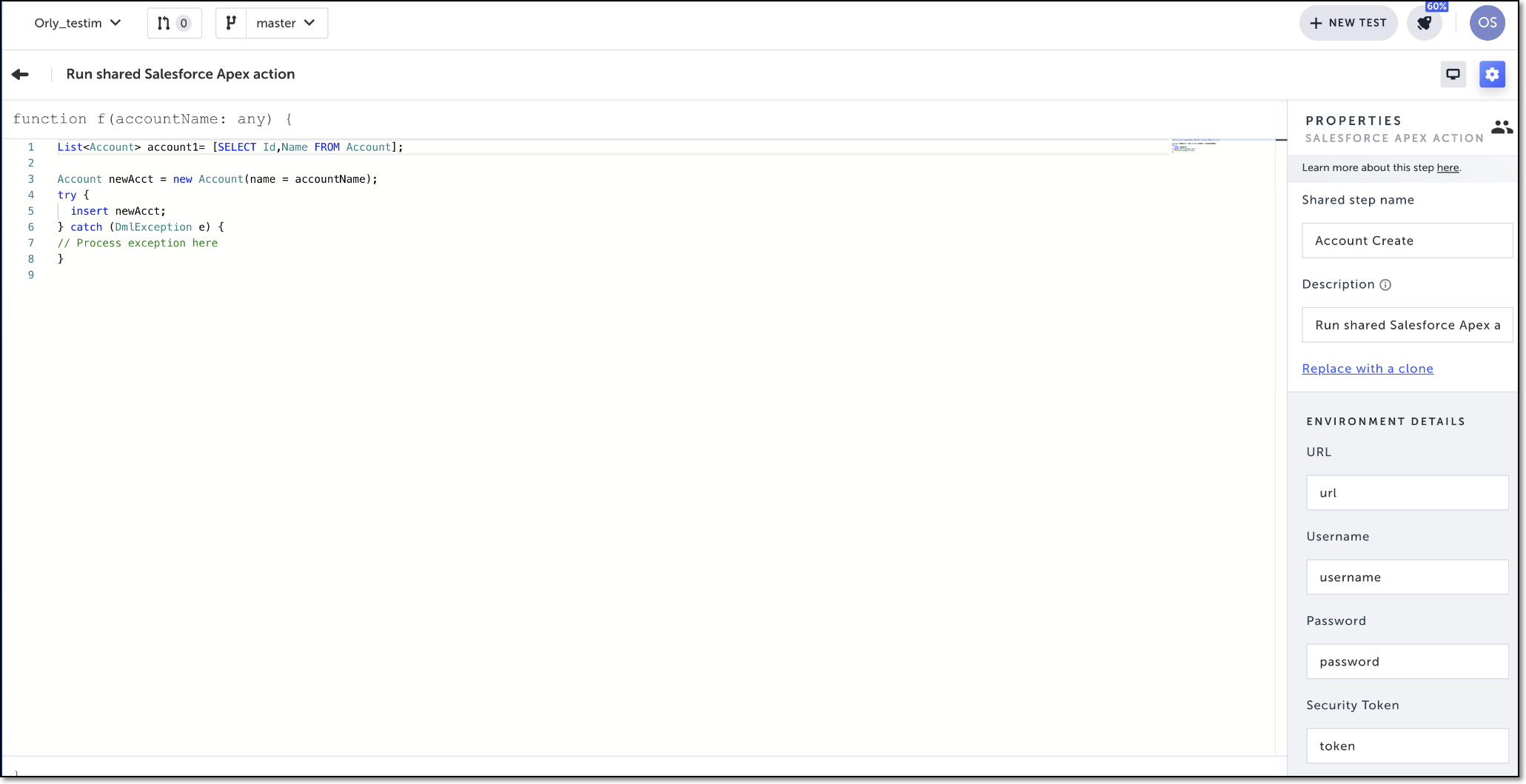 In this scenario we will use the Salesforce APEX action step to create a new account. In Salesforce there is a rule that copies the account name to another custom text field called 'mySpecialField' in the Account Object. Additional steps validate that the rule was applied by checking that in both fields (accountName and mySpecialField) the name is the same.
