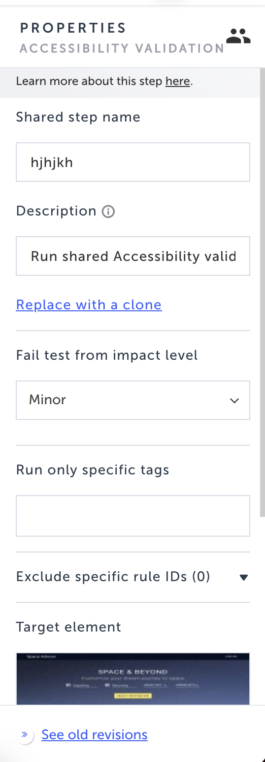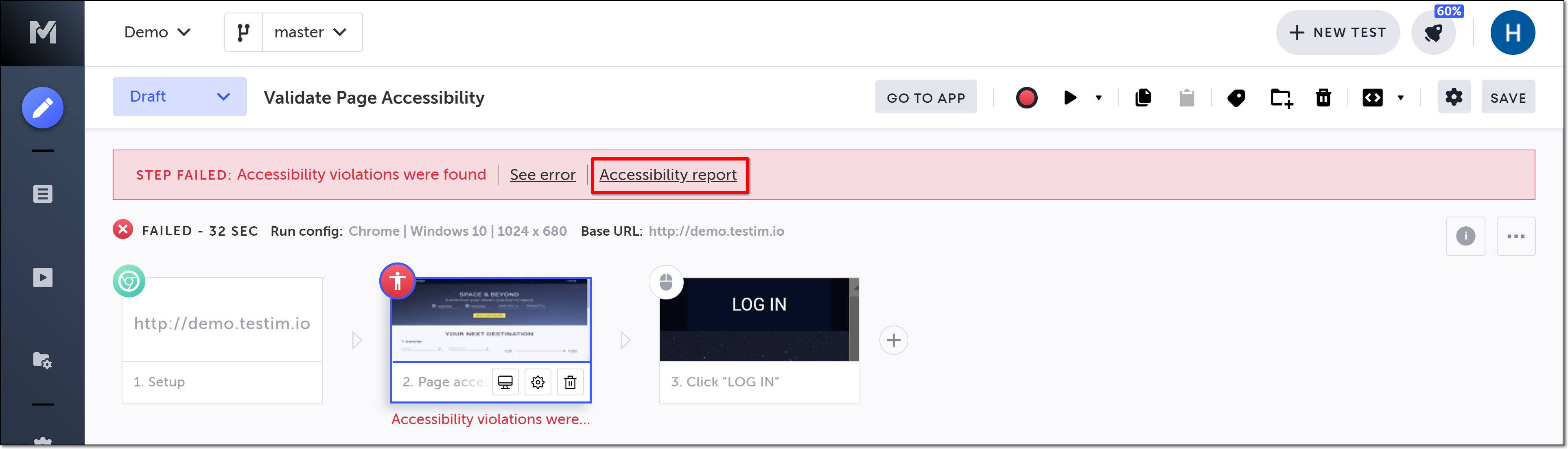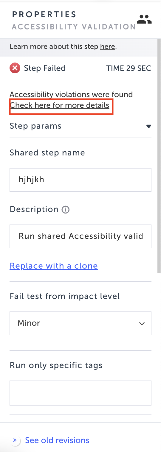 When the test is run, the accessibility level of your page will be checked against the parameters you set. If accessibility violations are found and the step fails, you can view the accessibility report to see detailed results.