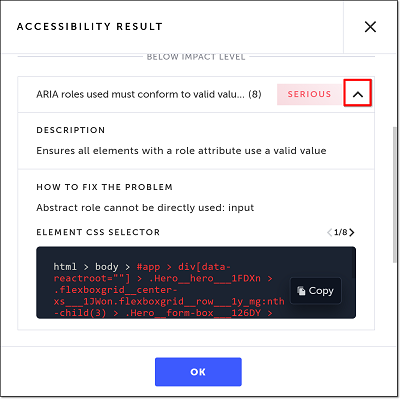 If more than one occurrence of an accessibility issue was found, click the arrows in the Element CSS Selector section to show the different instances of the issue.