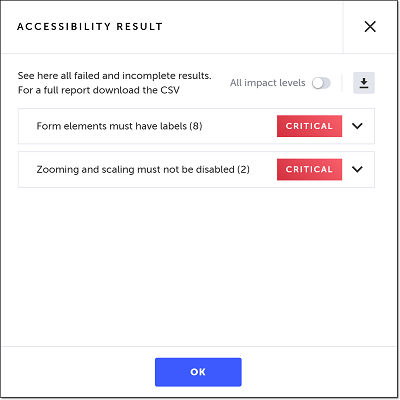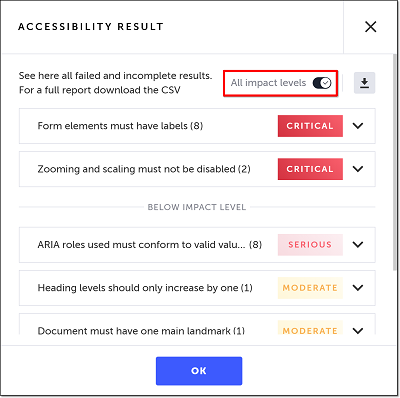 If you would like to show the accessibility issues found based on all of the impact levels, click the All impact level toggle.