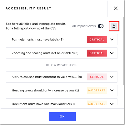 If you would like to download the results as a CSV file, click the download icon. (The CSV file includes the results of all of the accessibility tests, including those that passed.)