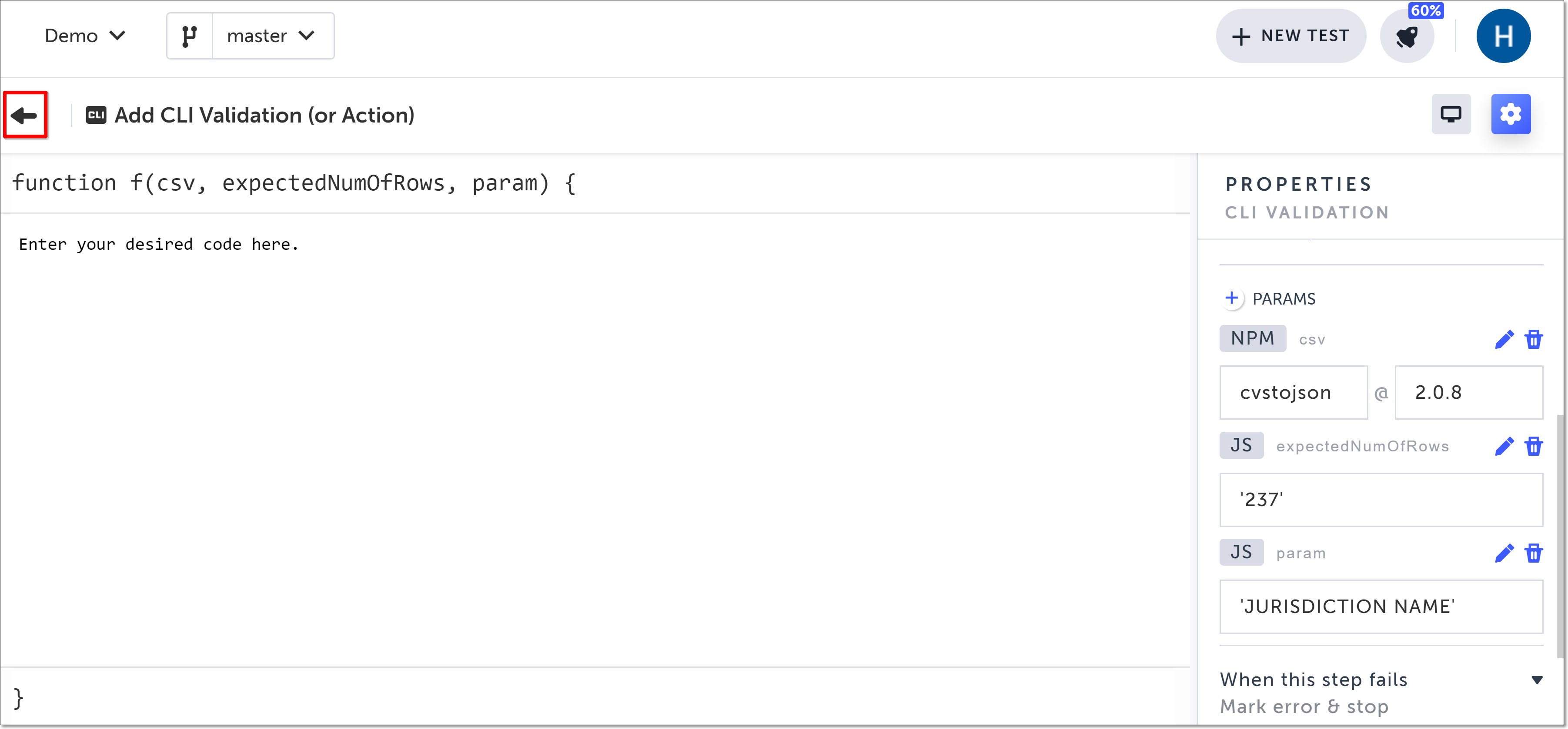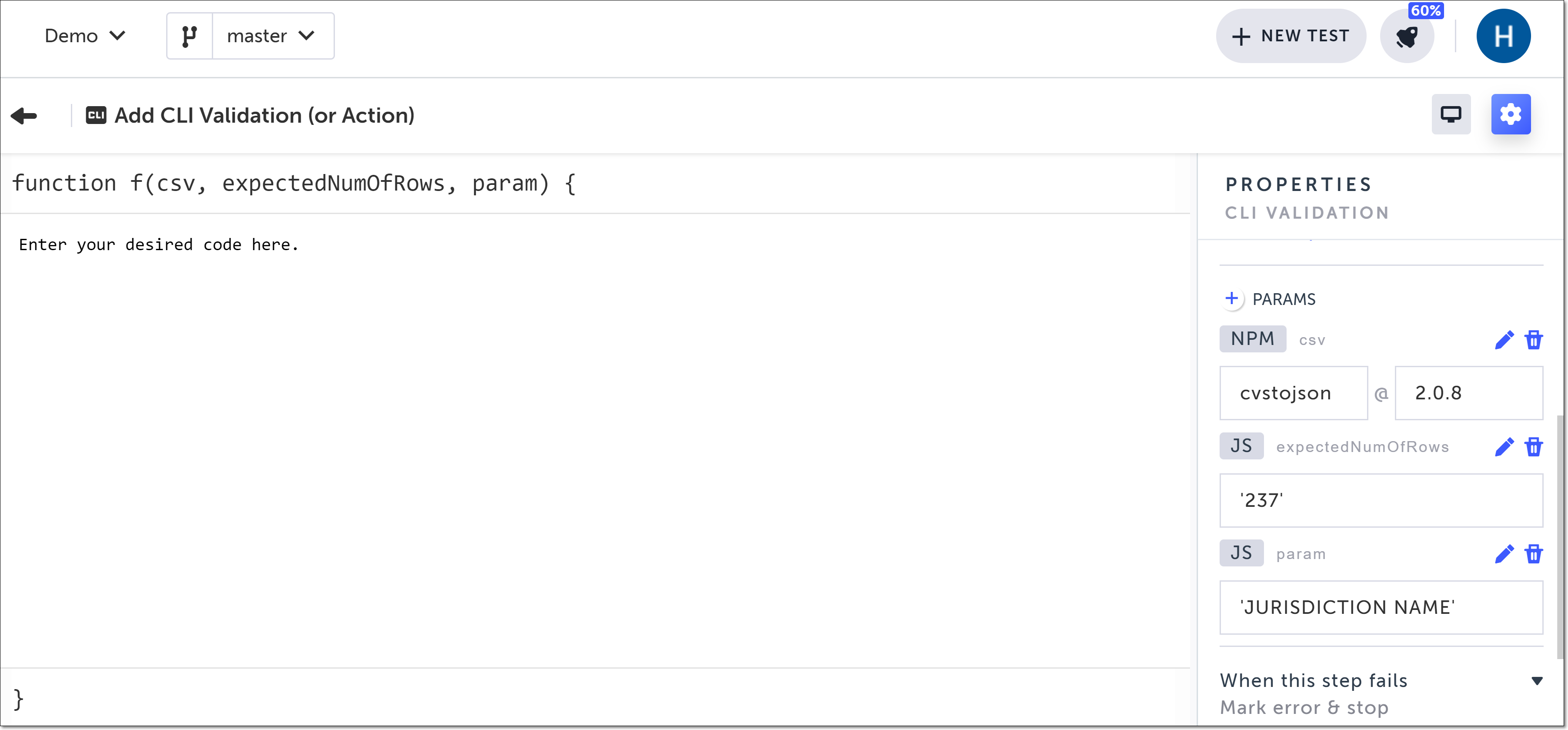 In addition to writing custom validations and actions (which execute in the browser run-time environment), you can also create custom Node.js scripts that are executed in your CLI environment. These scripts are initiated from inside a test just like a standard custom action. However, unlike custom validations and actions, CLI actions and validations open the gateway for some very advanced actions such as database validation and manipulation, image and PDF validations, and other validations. The real power of CLI steps comes from the ability to add any node package directly from npm (or any other source) and have those packages scoped to the CLI step during the execution of the test. We support all of the standard methods for defining package dependencies. In addition to the Add CLI validation and Add CLI action steps, there is also the Validate download step, which is a specialized CLI step which allows you to validate that the download content of various file types are as expected. For more information, see Validate download.