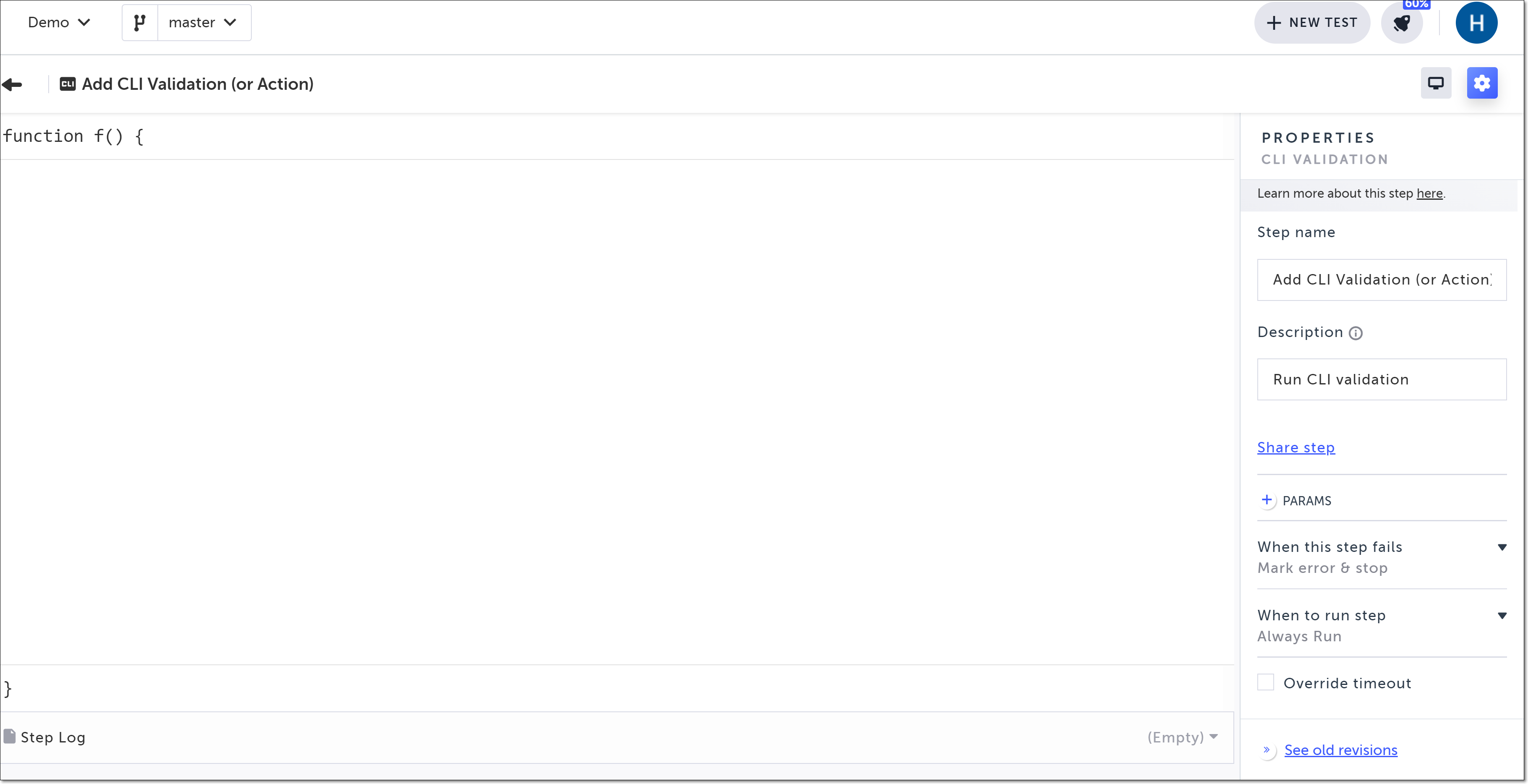 In the Properties panel, in the Description field, optionally edit the description of this step. The default description is “Run CLI validation” (or “Run CLI action”).