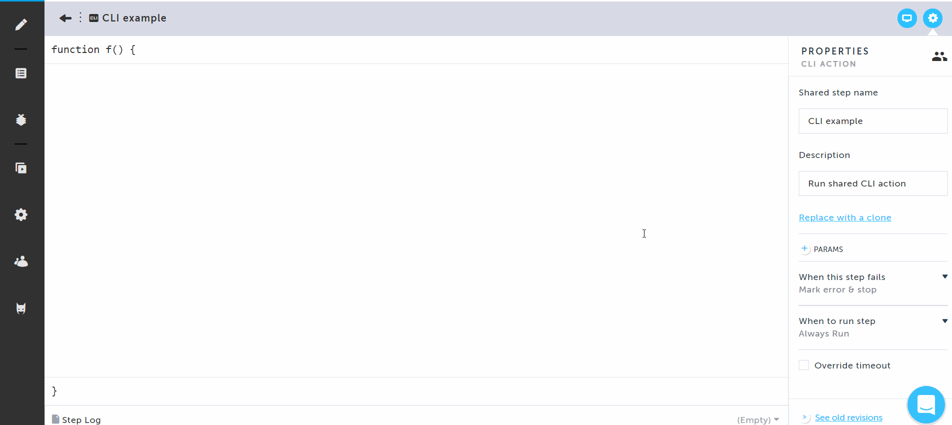 Logs generated during the CLI action step will be displayed in the terminal, initiated in the execution, and preserved within the step in the 'Step Log' section at the bottom.