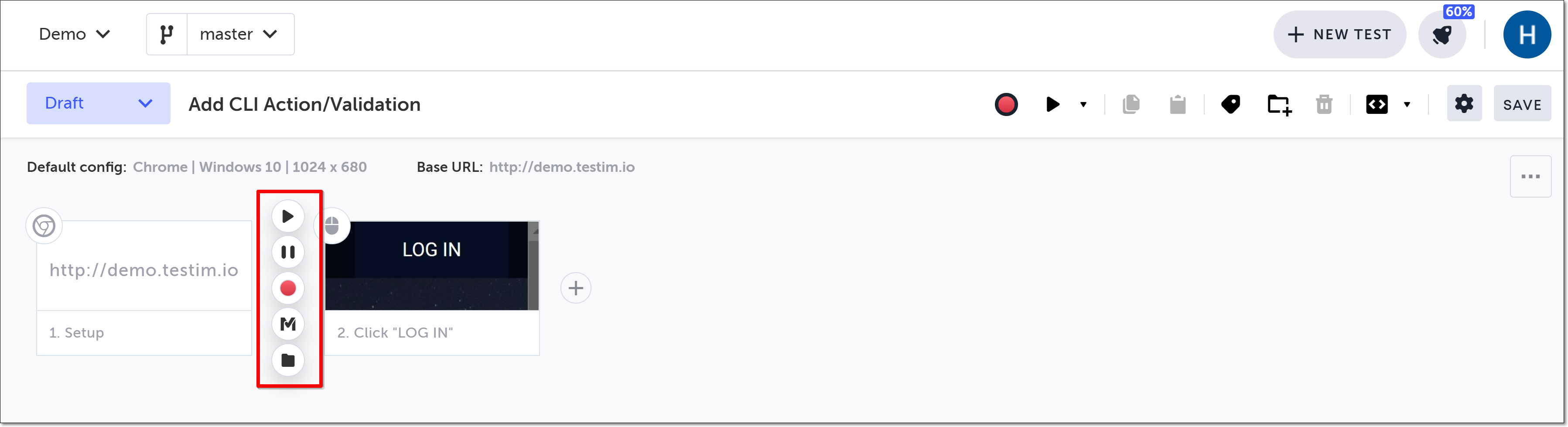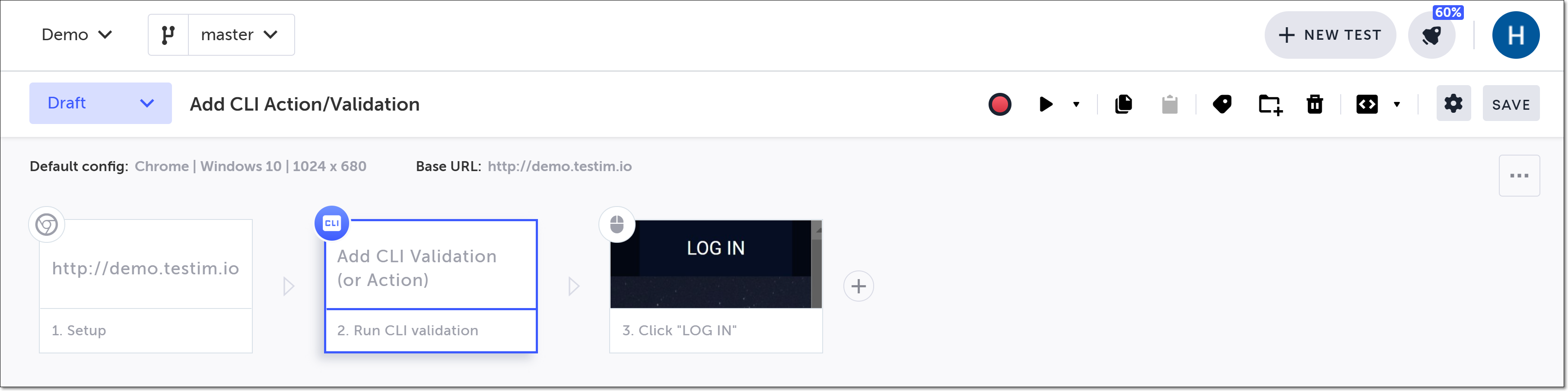 In order to locally run tests which contain CLI validation or action steps, the following command needs to be executed: npm i -g @testim/testim-cli && testim connect (see below).