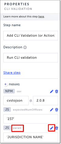 d. The selected element is automatically named “param” or “packageVariable” (depending on whether you chose a JS parameter or NPM package variable). To assign a relevant name to the parameter/variable, click on the edit icon and enter the desired name.