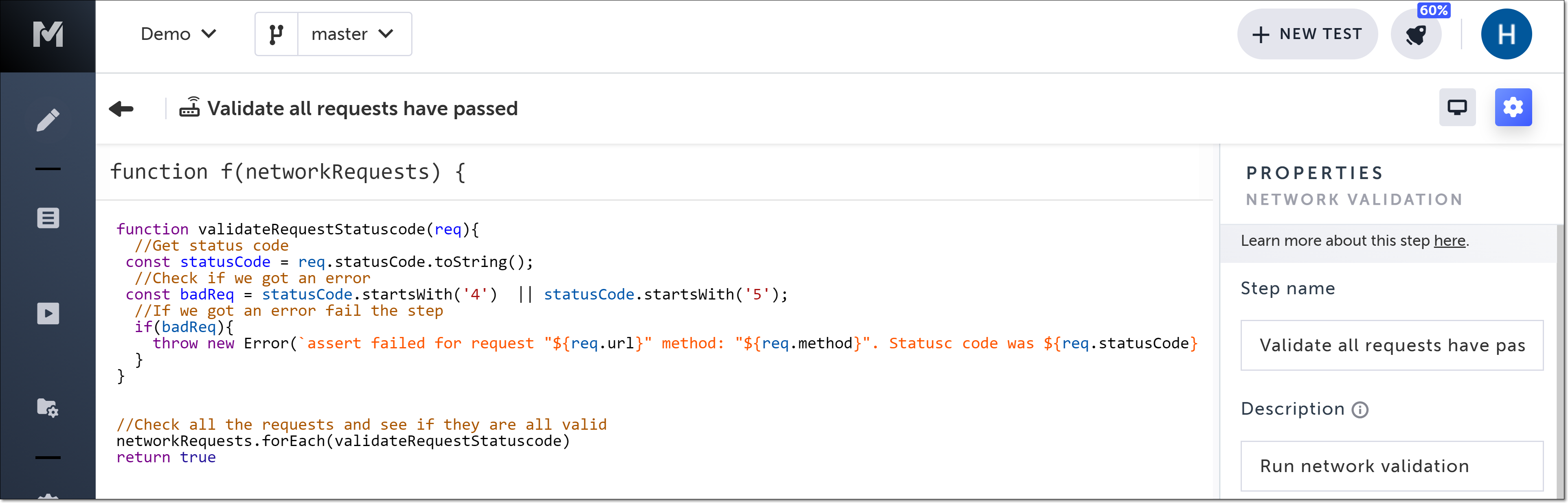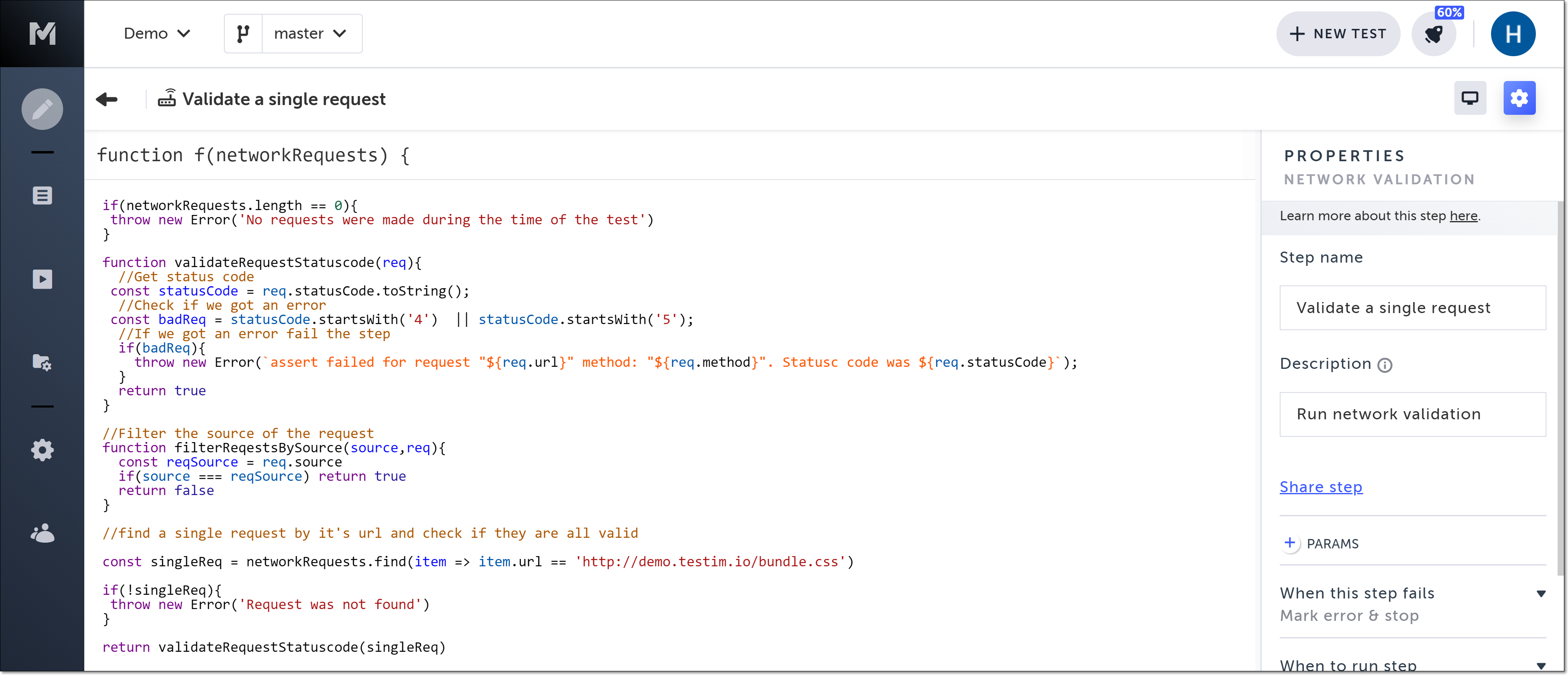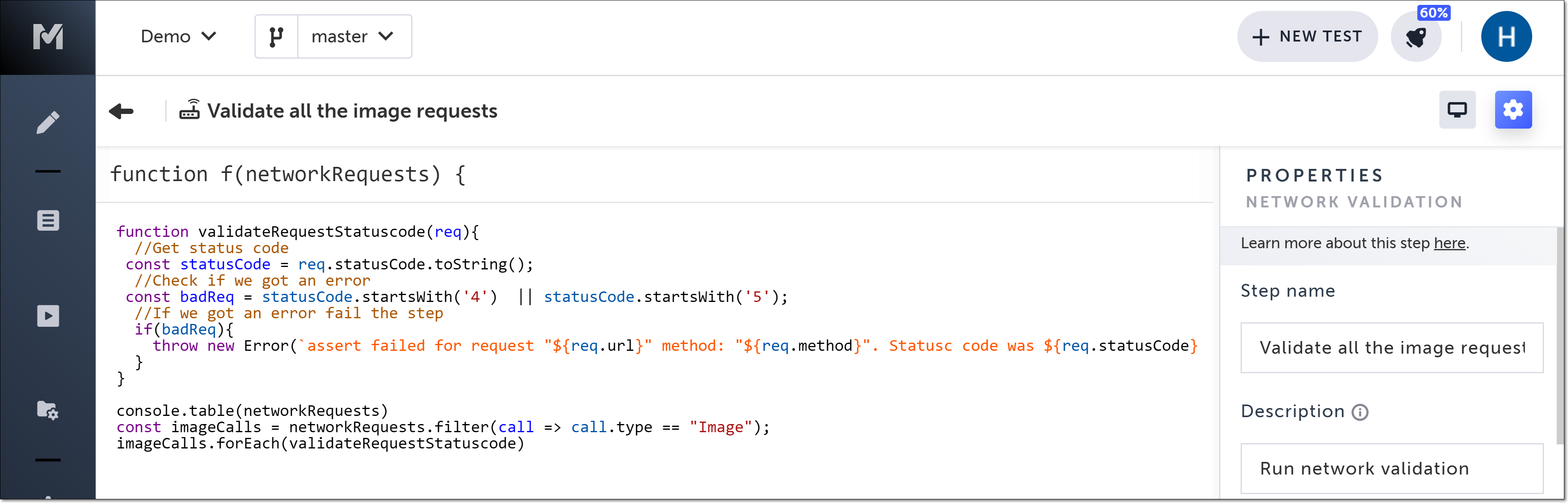 The network validation step allows you to validate your network requests. It is a predefined validation step that receives an array (networkRequests) of objects (see table below). This step enables you to run JavaScript code on the networkRequests array.