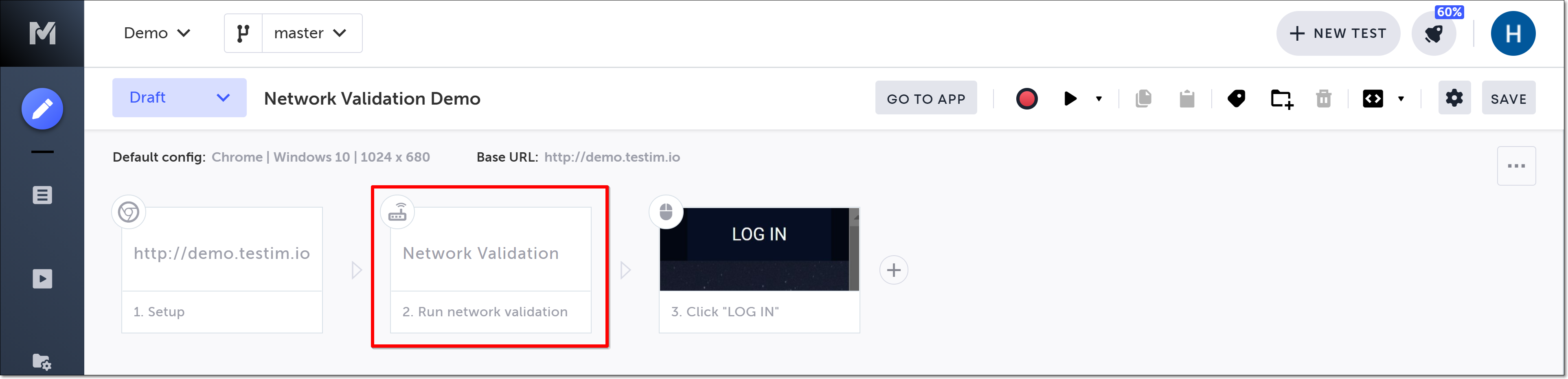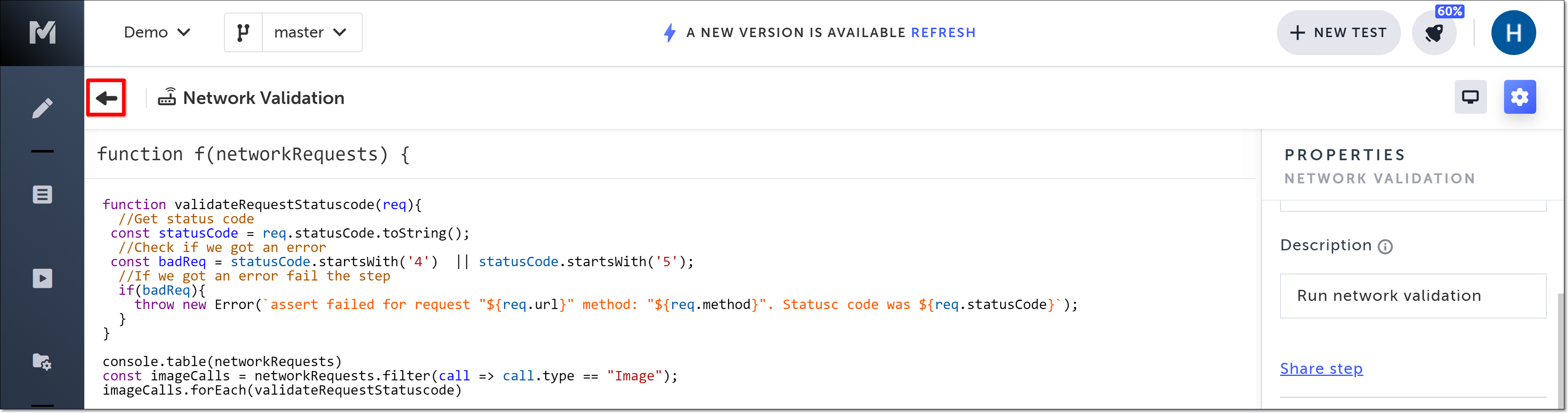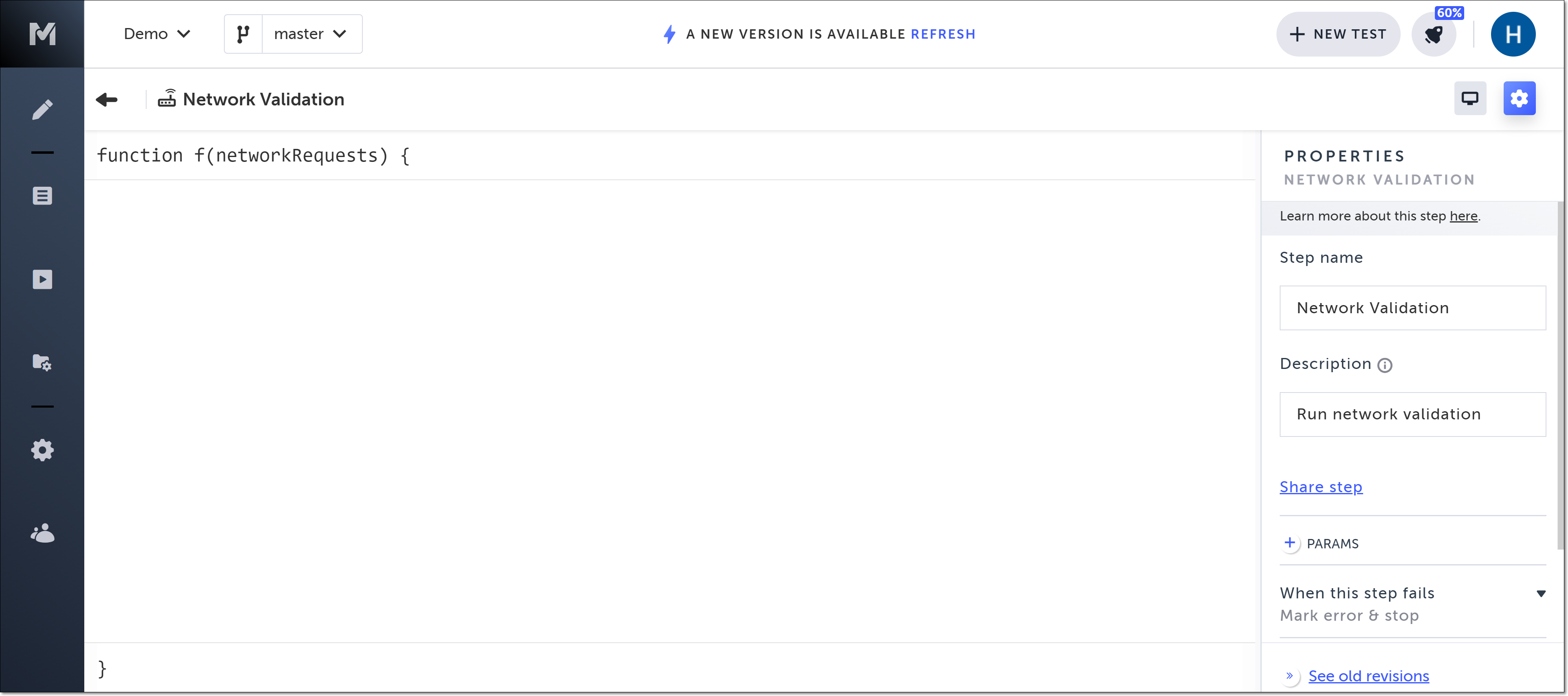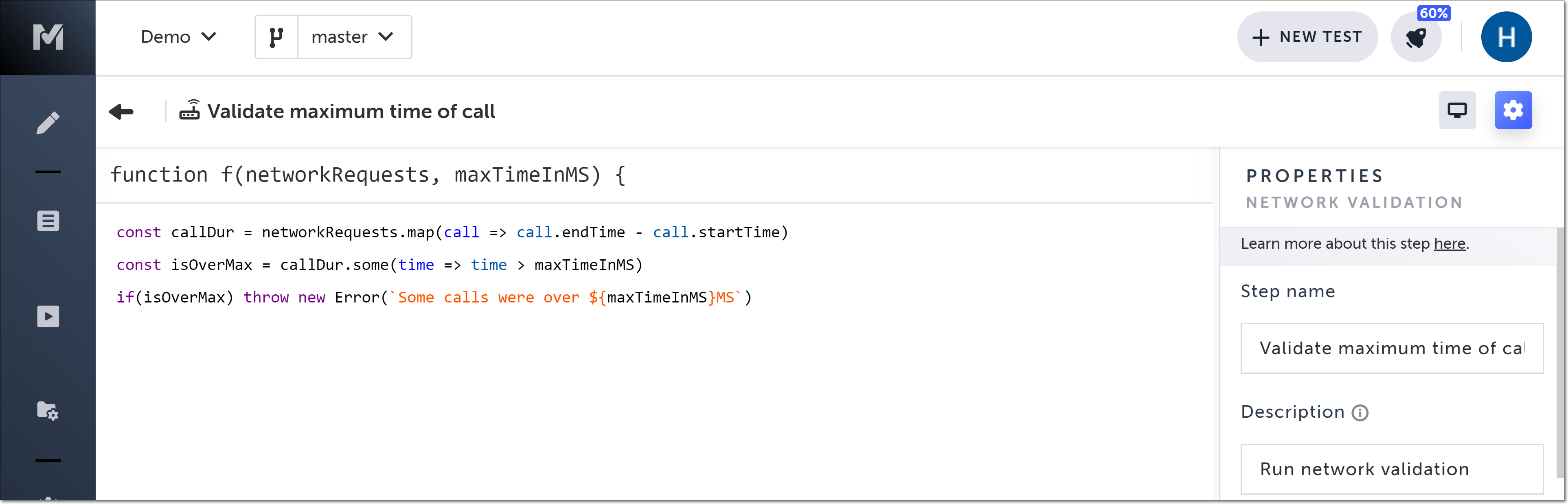 The network validation step allows you to validate your network requests. It is a predefined validation step that receives an array (networkRequests) of objects (see table below). This step enables you to run JavaScript code on the networkRequests array.