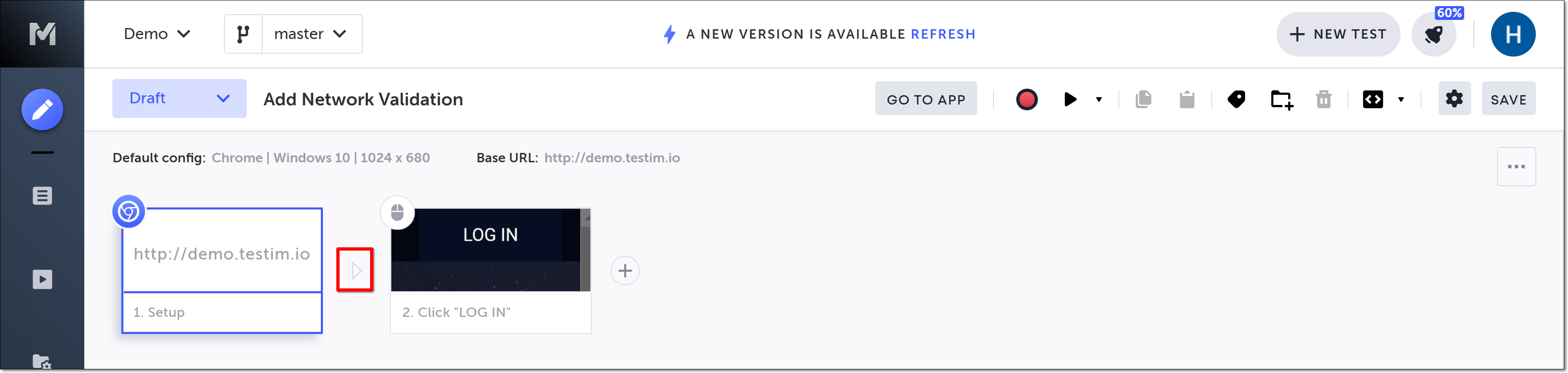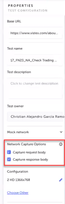 As part of the network validation, in addition to the array of objects captured in the request/response, as described above, it is also possible to capture the request and/or response body and then use the add network validation step to perform validations on the body content. The body content itself will not be shown in the network logs, but will be added to the networkRequests array.