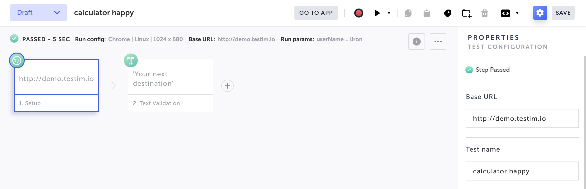 When you run your test, each validation step will either pass or fail depending on whether or not the validation criteria were met. If the validation step passes, the icon in the upper-left of the test step is shown in green, and there is a message in the Properties panel showing that it passed.