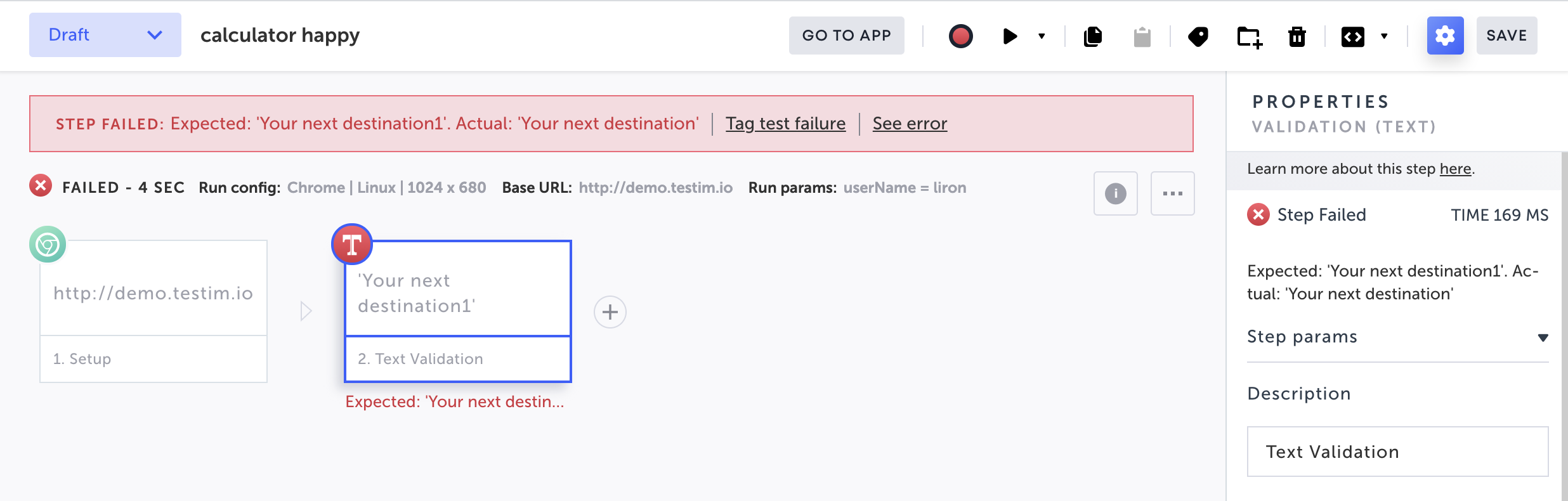 If a validation step fails, the icon in the upper-left corner of the test step turns red, and there is a message in the Properties panel showing that the step failed. Additionally, a red bar will appear at the top of the Editor indicating that the step failed. The red bar shows the expected and actual values for the failed step. There is also a See error link that can be clicked in order to open the full error message.
