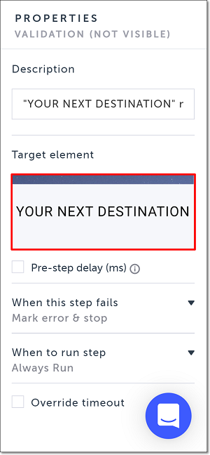 If you want to change the element you selected, you don’t need to delete and re-record the step. Instead, you can just reassign the element with a different element. → To reassign the selected element in a Validate element not visible step: