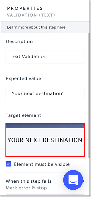 If you want to change the element or text you selected, you don’t need to delete and re-record the step. Instead, you can just reassign the element with a different element, or you can edit the text of the initial element that is being validated.